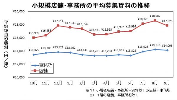 小規模店舗(20坪以下)の平均募集賃料は、前月から4.1%下降しました。