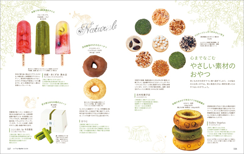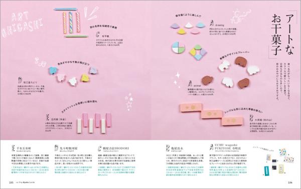 アートなお干菓子、四季を彩る上生菓子、透きとおる和菓子、おやつパン、魅惑のショコラトリー、やさしい素材のおやつ、京の和菓子ごよみ、の7テーマに加え、スイーツ柄の雑貨のページも掲載。