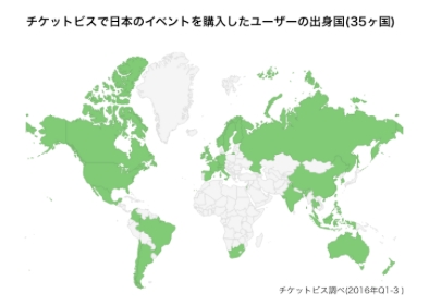 チケットビスにおいて、外国人による日本開催イベントの購入数は昨年より約2倍増(昨対比191%)で、購入者の出身国は35ヶ国にのぼりました。日本以外の国でも、インバウンド売上が大きく伸びており、チケットビスの越境売上はStubHub (eBayグループ)の買収とも大きく関係しています。(チケットビスは2016年5月にStubHub傘下となることを発表)