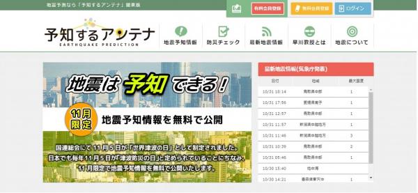 地震発生の約1週間前に現れる前兆現象をとらえて時期・地域・規模を予測し、地震予知情報をお知らせする地震予知情報配信サービス「予知するアンテナ(http://yochisuru-antenna.jp/)」は2016年9月1日のサイトオープンから2ヶ月で家族を持つ30代の男女を中心に1,000人以上の方に登録いただいております。この度は、11月5日の「世界津波の日」に先がけ、防災意識の啓発として一部の有料コンテンツ(地震予知情報)を2016年11月1日から同30日までの1ヶ月間に限り無料提供することと致しました。