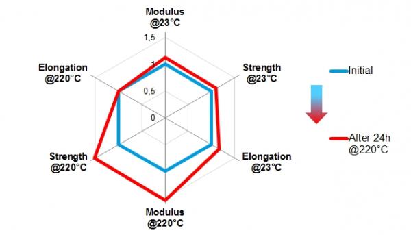 こうした課題に対処するため、ソルベイは樹脂の分子構造に影響を与えない独自のsmart molecule自己補強テクノロジーを採用したTechnyl(R) REDxを開発しました。この新しいテクノロジーは、自動車部品などを射出成形する工程においては不活性の状態を維持し、高流動性PA66と同様の挙動を示します。自動車の使用時には、温度上昇に伴ってスマートテクノロジーが活性化し、急速に架橋することで初期値よりも大幅に機械的特性が向上します。