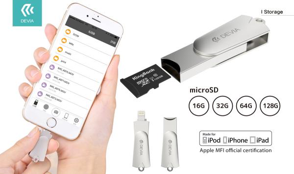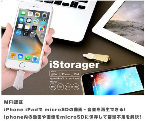 iStorager(アイ・ストレージャー)は、APPLE製品認証 MFi(メイド・フォー・アイフォン/アイパッド/アイポッド)取得製品で、APPLE iOSデバイスのLightning connector (ライトニングコネクター)付き端末は全て使用が可能なアクセサリーです。