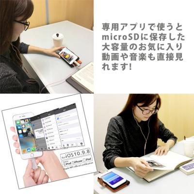 (MicroSDカード内の動画や音楽を直接見たり聞く事ができ、iPhone内の画像や動画、アドレス帳をMicroSDカードに保存出来るコネクター)