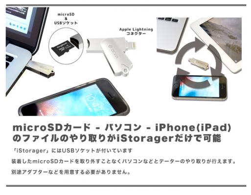 パソコン、MicroSDカード、iPhone/iPad/iPad,間のデータ移動を簡単にネットワーク通信なしですることができる iStorager 端末切り替え時や、データ整理に非常に役に立つアクセサリーです。