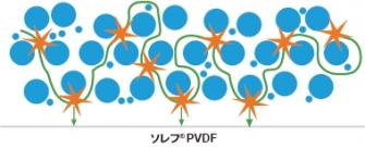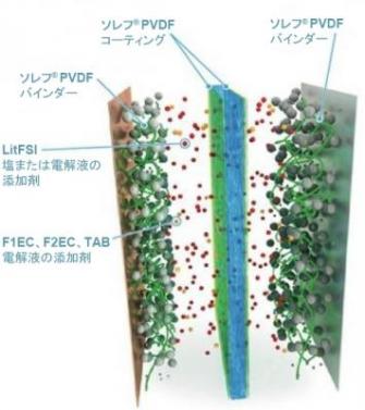 また、ソレフ(r)5140は活物質粒子や導電剤との間で非常に優れた結着性も備えているため、これまでより少ないバインダー添加量でも長い寿命が確保されるほか、高いエネルギー密度が得られます。フッ素樹脂鎖に分布する極性官能基により、内部抵抗も小さくなっています。バインダーの優れた耐薬品性により、有機カーボネートやリチウム塩が含まれるLiイオン電池の過酷な環境でも長期安定性が確保されます。この新しいバインダーグレードは、定評のあるソルベイの正極および負極用ソレフ(r)5130およびソレフ(r)5120 PVDFバインダーの既存製品群を拡充するものです。