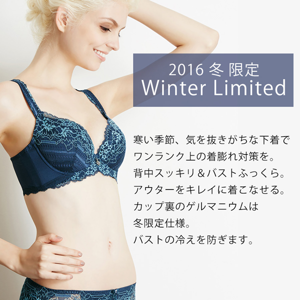 そこで当社は、ブラジャーのカップ内側のサイドパネルにバストの冷えを防ぐゲルマニウム加工を施した「脇肉キャッチャーLIGHT ラグジュアリースタイル 2016」を発売。バストの冷えを防ぎ、寒い季節のバストケアをサポートいたします。また、脇肉キャッチャーシリーズの中では軽い着け心地ながら、脇高設計で脇からはみ出るお肉をすっきりとさせるため、“痩せ見え効果”で若々しい印象に。サイドパネルがバストを下から持ち上げ、前中心のクロステープが谷間をキープしてくれるので、バストラインにも自信が持てます。