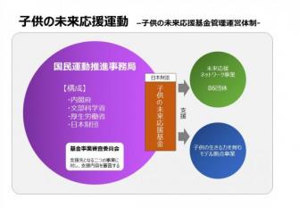団体を支援する資金は、内閣府などが中心となった事務局が子供の未来応援基金として広く集め、日本財団を通して、審査委員会により採択されたNPO団体などの支援となる。この基金を通しての事業はもう一つ「子供の生きる力を育むモデル拠点事業」があり、行政や支援団体単独では実施困難な施策を公益財団法人日本財団が中心になって行う。全体の活動は「子供の未来応援国民運動」として、内閣府、文部科学省、厚生労働省、日本財団が中心となって事務局を構成している。