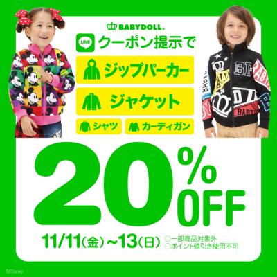 BABYDOLL LINE@友だちを対象に、ジャケット、ジップパーカー、シャツ、カーディガンが20%OFFになるお得なLINEクーポンをプレゼントします。