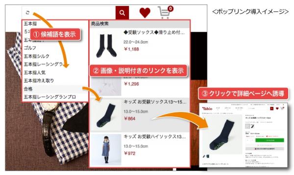 「ポップリンク」は、タグの張付けのみで実装いただけるツールです。システムの改修無しに、検索窓に商品提案の機能と離脱防止のナビゲーションを付加します。商品を「指名買い」するリピーターに対しては、最小の文字入力で意図する商品を提示してスムーズな購買を助けるほか、下記のような商品提案力の強化にもご活用いただけることで、今回、タビオ公式販売サイトにご導入いただきました。