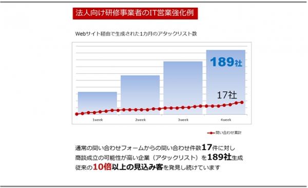 ITレンジャーを導入している法人向け研修事業者の場合、Webサイト経由でのお問い合わせ(問い合わせフォームからのリクエスト)が月間17件であるのに対し、ITレンジャー独自サービスである「製品やサービスに興味があり商談成立可能性がある企業リスト」の生成件数は月間189件と10倍以上のアタックリストを生成しています。