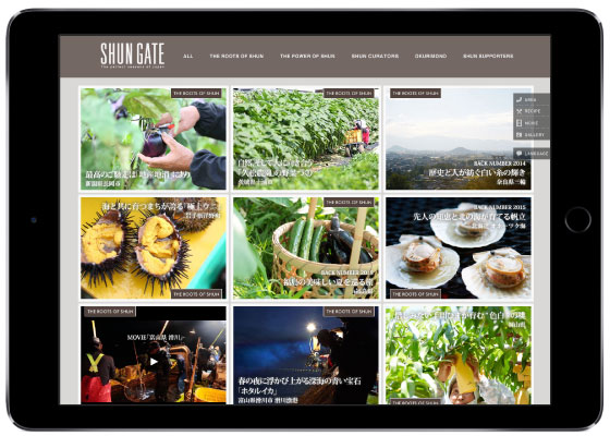 「SHUN GATE」は、日本の食文化のストーリーを世界の多くの人に伝え、日本に訪れて日本の食文化を体験して欲しいという想いのもと、凸版印刷株式会社を事務局として開設されたWEBメディアです。サイト名の「SHUN(旬)」とは、「食材の味が最も良いとき」のこと。言語は日本語、英語、繁体字に対応し、国内外に向けて、「SHUN(旬)」を生む風土や地域、技術や人が形成する様々なストーリーを発信しています。