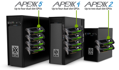 APEXX4シリーズは軽量でメンテナンスが容易な設計に加えて2スロット占有プロフェッショナルGPUを最大4基搭載可能、加えて独自の冷却機構と水冷冷却装置により静音(30db程度)でマシンパフォーマンスを最大限の性能を引き出すエントリー・ワークステーションです。また、オプションのラックマウント・キットを取り付けることで19インチラックへ搭載することも可能です。