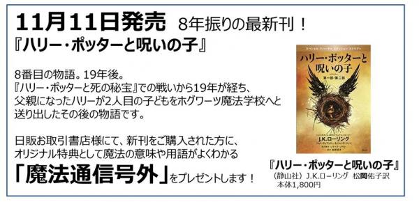 また、11月11日に発売される8年振りのシリーズ新刊『ハリー・ポッターと呪いの子』(静山社)を購入された方に、魔法の意味や用語がよくわかる「魔法通信号外」を特典としてプレゼントする書店店頭フェアも実施します。映画と書籍を連動させたフェアを実施することで、店頭でのさらなる訴求力アップを図ってまいります。