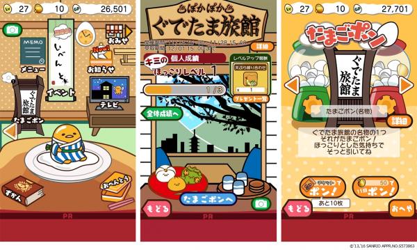 株式会社グッドラックスリー(本社:福岡県福岡市、代表取締役CEO:井上和久、以下「グッドラックスリー」)とギャザリング株式会社(本社:東京都千代田区、代表取締役社長:戸田和宏、以下「ギャザリング」)は、株式会社サンリオ(本社:東京都品川区、代表取締役社長:辻信太郎、以下「サンリオ」)よりライセンス許諾を受け、人気キャラクター「ぐでたま」が登場するゲームアプリ『さわって!ぐでたま ~しょうゆましまし~』(以下、本作)にて、2016年11月14日(月)より株式会社リーメントが販売する食玩「湯ったりぐったり ぐでたま旅館」およびTBS「あさチャン!」枠で絶賛放送中の「ぐでたまショートアニメ」と、期間限定コラボイベント「湯ったりぐったり ぐでたま旅館」を開催いたしましたことをお知らせいたします。