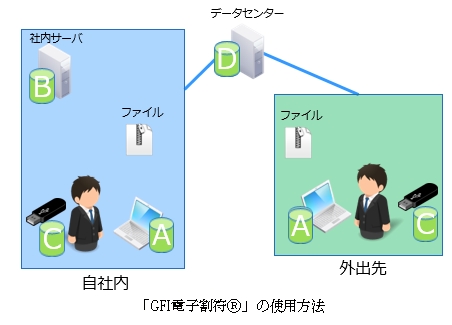 まず社外へ機密データを持ち出す前に、データA~Dの4つにそれぞれ分割します(例: モバイルPC、社内サーバ、USB、データセンター)。分割されたデータ単体は意味のない数字の羅列でしかありません。外出先では、モバイルPC、USB、データセンターに保存したデータを集め、復元します。この場合、すべてのデータを用意する必要はなく、モバイルPCを紛失しても残りのデータで元ファイルを復元できます。