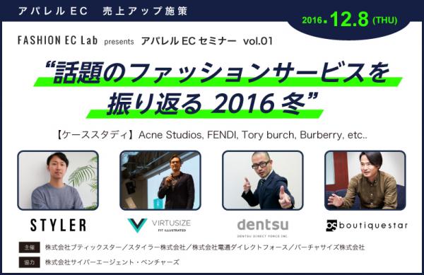 第一回目のセミナーはスタイラー株式会社、株式会社電通ダイレクトフォース、バーチャサイズ株式会社の4社共催で2016年12月8日(木)に開催します。各社による講演の他、4社スピーカーによるパネルディスカッションも行います。
