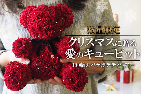 メッセージローズベアーは、土台から一体一体ハンドメイドでお作りし、顔や手足、胴体など全体のバランスを見ながらバラを配置しています。使用している赤いミニバラは約300輪。赤いバラには「愛」や「愛情」といった花言葉があることから、愛する家族や恋人と過ごすクリスマスギフトとして最適です。間もなく訪れる年に一度の特別な日・クリスマスに大切な人へと贈るプレゼントとして是非お渡し下さいませ。