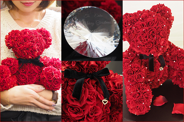 メッセージローズベアー全体に、スワロフスキー社製のラインストーン約200粒を付けるデコレーションをご用意しています。世界中の女性を虜にする美しいキラメキをローズベアーにも取り入れ、クリスマスプレゼントやプロポーズに合うカスタマイズとしてご提供します。