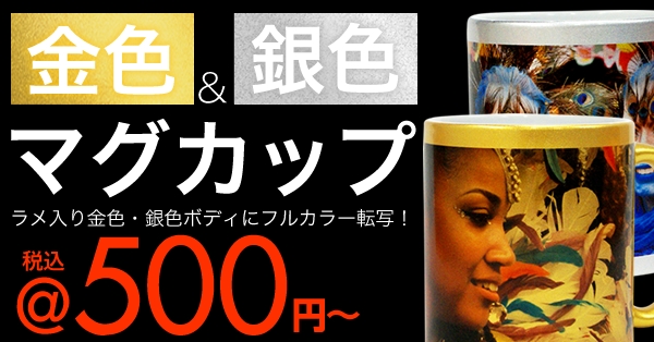 オリジナルプリント.jpのこの金色マグカップや銀色マグカップなら、はじめから金色や銀色に塗られているので、煌びやかなデザインやゴージャスな仕上がりのマグカップが作成できます。