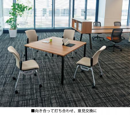 多彩な天板形状でベーシックなかたちの会議、向き合って打ち合わせをするブレストミーティング・意見交換、セミナー型など用途に合わせた自由なレイアウトが可能です。また、キャスタータイプも用意しており、研修などのミーティングスタイルでも活発な意見交換の場を実現します。