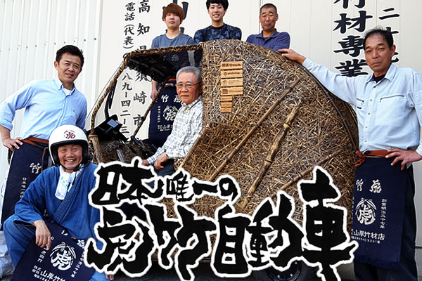 竹トラッカーは高知県須崎市安和特産の「虎斑竹(とらふだけ)」を使いヤタラ編み、網代編み、ヒシギ張りなど竹編みの技術で仕上げられた日本唯一の虎竹自動車です。製作にはクラウドファンディングを通じて、全国135名様から350万円の資金のご協力をいただきました。