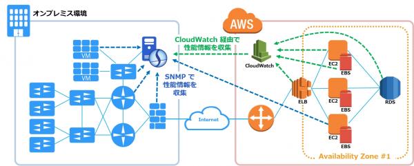 「System Answer シリーズ」は、SNMP プロトコルを用いて収集したネットワーク・サーバー機器、および仮想環境の性能情報のみならず、CloudWatch から AWS 上のシステムの性能情報を取得することによって ICT インフラ環境の一元管理を実現いたします。
