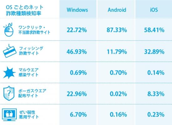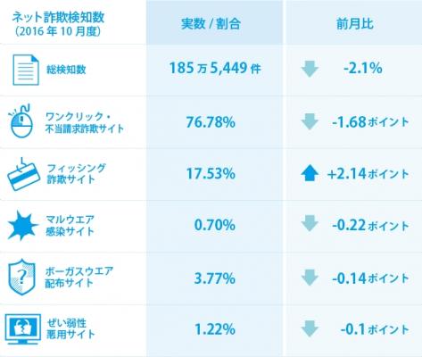 インターネット詐欺の種類別構成比は、ワンクリック・不当請求詐欺サイトが76.78% (前月比1.68ポイント減)、フィッシング詐欺サイトが17.53%(前月比2.14ポイント増)、マルウエア感染サイトが0.70%(前月比0.22ポイント減)、ボーガスウエア配布サイトが3.77%(前月比0.14ポイント減)、ぜい弱性悪用サイトが1.22%(前月比0.1ポイント減)でした。