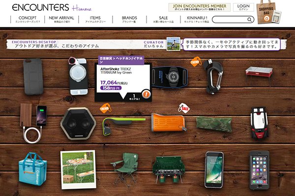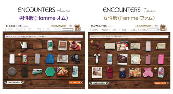 ENCOUNTERSでは、スマートフォンケースをはじめ、ガジェットや雑貨、家電にグルメなどの高品質な商品を取り揃えています。机の上に商品が雑然と並ぶ「デスクトップ」という見せ方の中で、キュレーターによる商品セレクトだけでなく、偶然や意外性もキュレーションにおける一つの価値判断の基準と捉え、「まだ見ぬお気に入り商品」と偶然出会える可能性を秘めた新感覚キュレーション型ECサイトです。