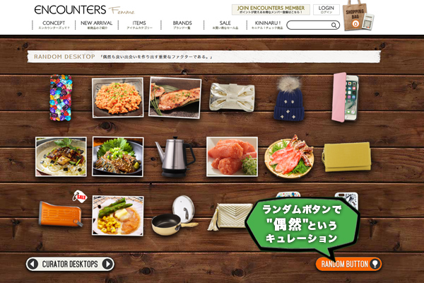 「ランダムボタン」を押すたびにデスクトップに並べられた商品が入れ替わり、これまで興味を示さなかった、または知り得なかったジャンルや商品を出現させ、リアル店舗で体験することが多い、「良い商品との偶然の出会い」を演出しています。