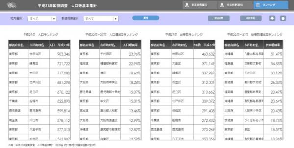 「3PDG On Demand」のコンテンツ「平成27年国勢調査 人口等基本集計」では、全国市区町村単位の人口、世帯数およびその増減率の把握や、ランキング形式に切り替えてデータを表現することも可能です。