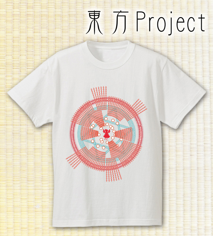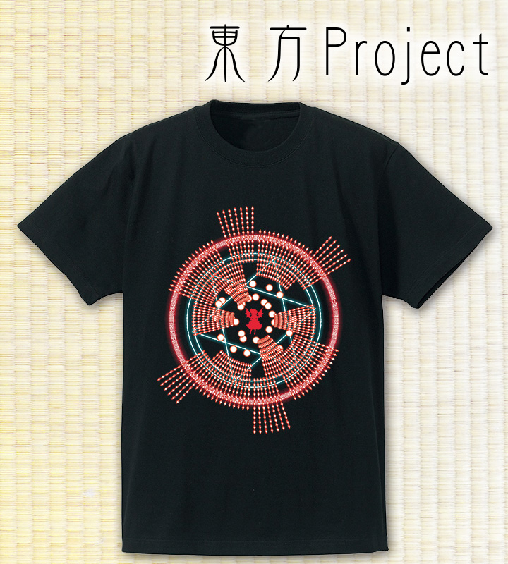 スペルカードの美しい弾幕をダイナミックに配置したTシャツは、着ても飾っても楽しんでいただけます。