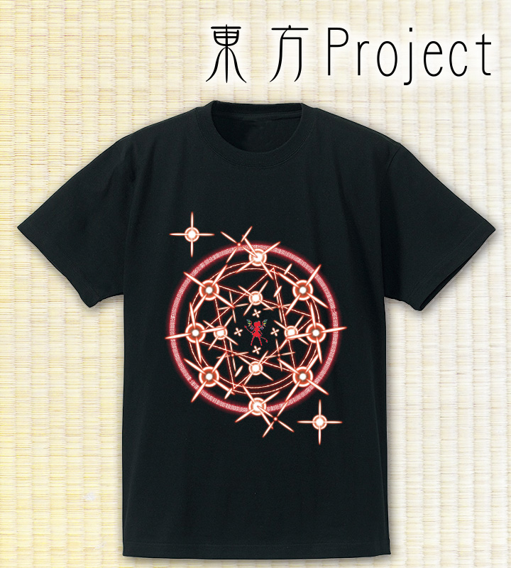 紅魔館の吸血鬼「レミリア・スカーレット」のスペルカード魔符「全世界ナイトメア」と、「フランドール・スカーレット」のスペルカード禁忌「禁じられた遊び」をモチーフにしたデザインTシャツです。