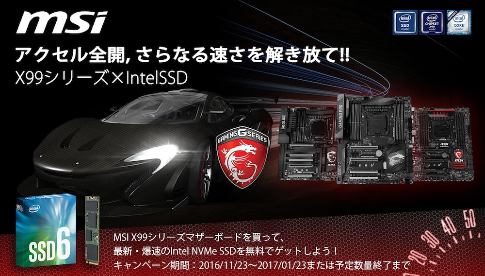 2016年11月22日-Micro-Star International Co. Ltd., 台湾・台北市- マザーボードの設計で世界をリードするMicro-Star International(MSI)は、対象のIntel X99マザーボードをご購入の方に、Intelの最新M.2 SSDであるIntel SSD 600p 128GBをプレゼントするキャンペーンを11月23日から2017年1月25日まで実施いたします。