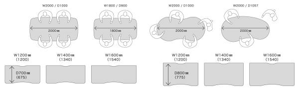 テーブルタイプは、緩やかなカーブで繋いだストレート型2種(W2000×D1000mm、W1800×D900mm)と、優しい印象のひょうたん型(W2000×D1000mm)、どこからでもアクセスしやすいビーンズ型(W2000×D1000mm)の4種類。