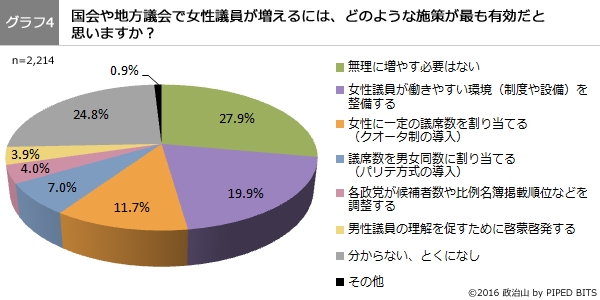 株式会社パイプドビッツ(東京都港区、代表取締役社長CEO 林哲也、東証1部パイプドHDグループ<証券コード3919>、以下「パイプドビッツ」)が運営する、政治・選挙情報サイト「政治山(せいじやま)」は、2016年11月11日から11月17日にかけて、全国の20歳以上の男女を対象に、女性活躍に関する意識調査を実施し2,214名から回答を得ました。本日11月25日に「政治山」で調査結果のサマリー版を公開しましたので、お知らせいたします。