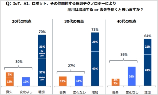 右図のように年齢層別に見ても、多数の回答者が振興テクノロジーは有効雇用を増やすであろうと予測しています。