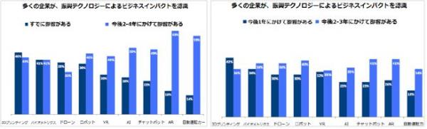 または、今後の展望を表しているのかもしれません。多くの人が、AR または自動運転カーといったテクノロジーは、2~4 年後に影響が表れるだろうと確信しています。 (上図左 「多くの企業が振興テクノロジーによるビジネスインパクトを認識」参照)