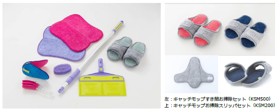 「キャッチモップ すき間お掃除セット」は、汎用性に優れた「花びらスティックキャッチモップ」をはじめ、ブラインドやエアコンのルーバーなどの掃除に重宝な「サッシ用キャッチモップ」、ミトンスタイルの「すき間キャッチモップ」、ユニークなスタイルの「お掃除スリッパ」などがセットになっています。定価は12,000円(実勢価格は7,980円)。「キャッチモップ お掃除スリッパセット」は、玄関先にもマッチしたカラフルな2色(ネイビーブルー、コーラルピンク)の「お掃除スリッパ」を2足セットにしたパッケージです。定価は5,000円(実勢価格は3,980円)。価格はいずれも税別です。