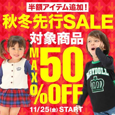 ベビー・キッズ服のBABYDOLL(ベビードール)がBABYDOLL(ベビードール)・STARVATIONS(スターベイションズ)各店、通販各店にて、11月25日(金)より秋冬先行セール!<50%OFFアイテム追加>を開催します。