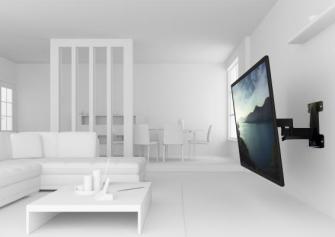 またダブルアーム仕様ですので、視聴位置に対し好きな角度に首を振ることが出来ます。本体アーム下部には電源コードや信号ケーブルなどをまとめて隠せるホルダーが付き、オプションの「ケーブルインレイ支柱」を組み合せることで、ケーブル類の壁面処理がすっきり行えます。