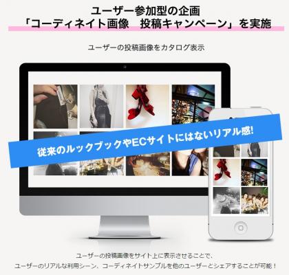 投稿されたハッシュタグ付きの画像をデジタルカタログ化し、サイト上に自動表示させます。それにより、従来のルックブックやECサイトにはないリアル感と「半歩先」のトレンドの提案が可能になります。
