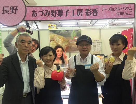 「彩香」は安曇野の菓子工房として、長野県産の素材 にこだわってお菓子作りをしています。「チーズinタルトバ ウム」に使っているりんごも長野県産の「ふじ」です。バウムクーヘンも小麦粉、卵、蜂蜜全て長野県産のものを使用しています。もともと、りんごのお菓子用にコンポートを作っていましたが、型崩れしやすいので、活用の仕方に悩み、開発したのがこのお菓子です。りんごは味を出すのが難しく、香料を使っている製品が多い中、本製品は生地に味をしみこませたりしてりんごをふんだんに使っているので香料を使わずにりんごの風味を出すことができています。 出展は今回で2回目で前回の2012年には別の商品で3位だったので今回はグランプリを目指して出場しました。