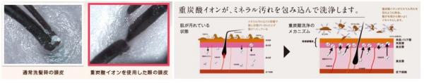 日々の生活の中で、皮膚や髪の毛のカルシウムやマグネシウムなどのミネラルに脂がつくことがニオイの原因となります。しかしシャンプーやボディーソープなどを使用してしまうとミネラルだけでなく角質まで剥がしてしまったり、洗い流しきれずにさらなるニオイの原因になってしまうこともあります。重炭酸倶楽部の「湯シャンタブレット」専用のシャワーヘッドに湯シャンタブレットを入れることで、美容液シャワーとなり、重炭酸イオンがニオイの原因であるミネラル汚れのみを包んで優しく洗い流すため、シャンプーやボディーソープ等の界面活性剤を使用することなく、洗浄することが可能になります。また、頭皮や髪が持つ本来のバリア機能を取り戻し、薄毛、抜け毛予防につながると共にコシのある強い髪を育てることが可能になります。