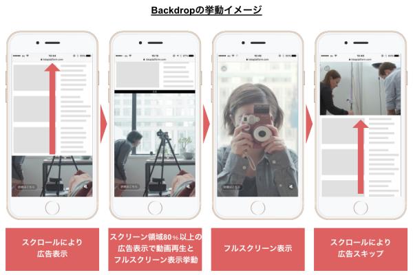 特徴1)従来のアウトストリーム動画広告の問題点を解決。縦型フルスクリーン動画広告フォーマット「Backdrop」で広告配信。