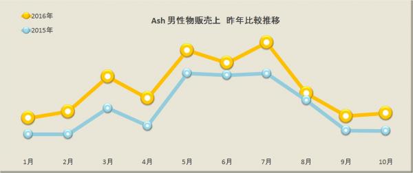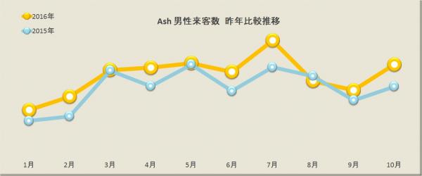 近年、特に若年層の美容室に対する精神的障壁の低さや理容室離れなどにより 男性の美容室利用が増加しています。Ashにおいても、2016年の男性来客数は昨年比105%(1~10月)と増加傾向にあり 男性向け物販に関しても好調に推移しております。
