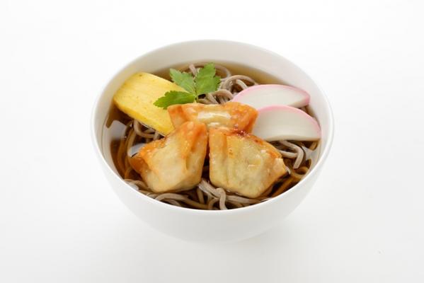 出汁のきいた年越しそばにナンジャタウンならではの餃子がのっています。