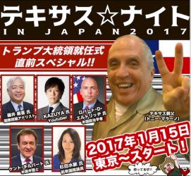 日本で大人気のテキサス親父こと、テキサス在住米国人youtuber、トニー・マラーノが帰ってきた。トランプ大統領就任をきっかけに動き出す新世界秩序!安全保障、日本防衛、憲法問題、TPP、中国との関係、アメリカはどうなってゆくのか、そして世界はどう動くのか? テキサス親父が全国駆け巡り、ケント・ギルバートや藤井厳喜、KAZUYA達と徹底討論します。爆笑、感動の大人気講演会、ついに復活です。