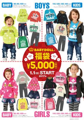株式会社コージィコーポレーションが運営するベビー・キッズ服ブランドBABYDOLL(ベビードール)が、BABYDOLL・STARVATIONS(スターベイションズ)各店にて、2017年1月1日より発売する<店舗限定福袋・5000円(税別)>の中身を発売に先駆けて一挙に公開。