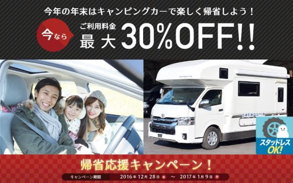 株式会社ファインシード(本社:東京都渋谷区、代表取締役社長:頼定 誠)が運営する、「東京キャンピングカーレンタルセンター(東京C.R.C.)」は、2016年12/29(木)~2017年1/9(月)までの期間を対象に、年末年始に帰省される方に向けて、キャンピングカーのご利用料金が、最大30%OFFになる『帰省応援キャンペーン』を実施致します。