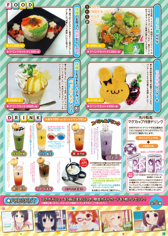 「珠輝のお母さん特製ちらし寿司」や「珠輝のおばあちゃんが作ったべっこうあめ」パフェといった、作中でも登場したご飯やデザートに加えて、"本田 珠輝"をはじめSNS部のメンバーや幼なじみの"布田 裕美音"をイメージしたドリンクなど、『ステラのまほう』の雰囲気を実際に味わえるコラボメニューが多数ラインナップ。